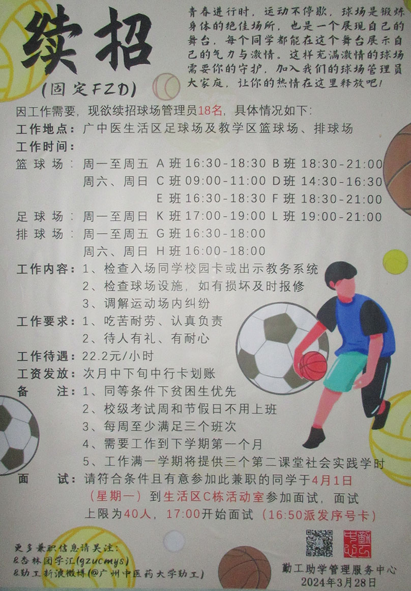 广中医-勤工-【续招】(固定FZD) 因工作需要,广中医生活区足球场及教学区篮球场、排球场-需续招球场管理员18名 勤工2024.03.28 |