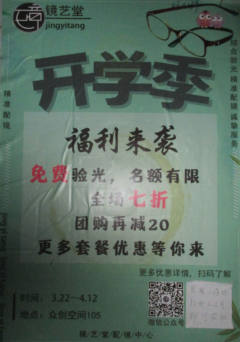 | 广中医生活区众创空间105室 镜艺堂配镜中心 开学季福利 免费验光,全场七折,团购再减20元 时间3月22号-4月12号 | ||||||