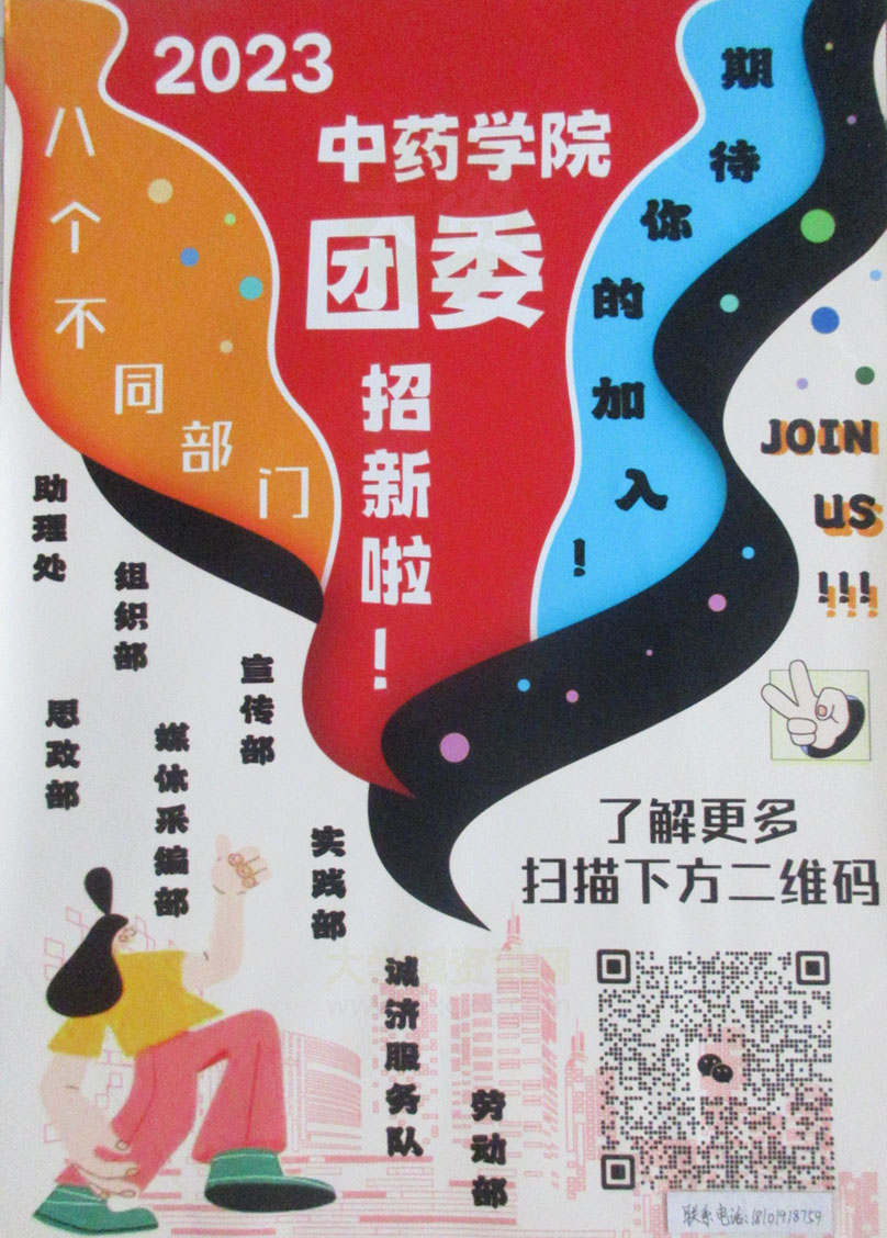 广中医-中药学院团委2023招新 八个部门 扫码了解更多 联系电话18101918759 |