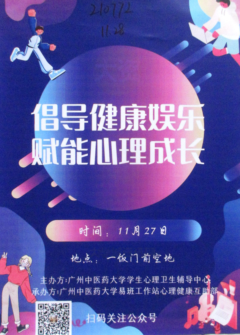 广中医 活动预告 倡导健康娱乐 赋能心理成长 时间11月27日 地点:一饭门前空地 |