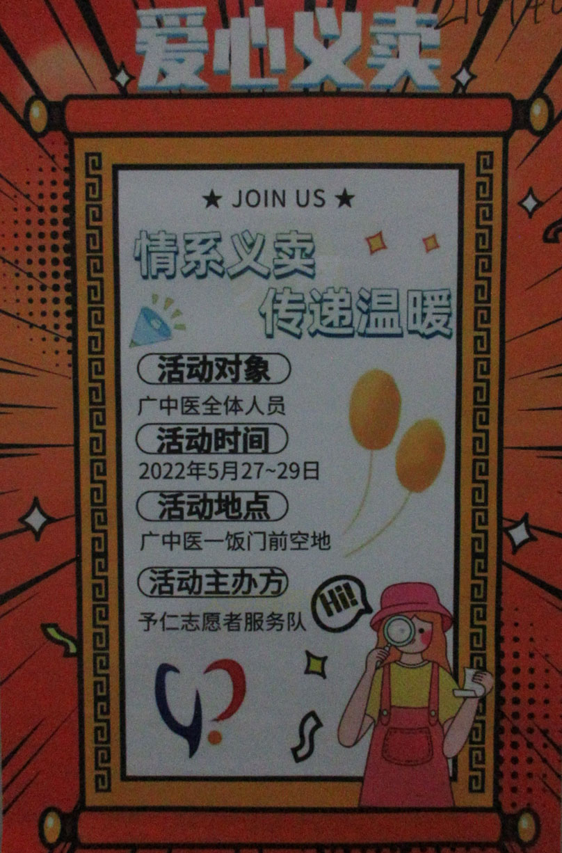 予仁志愿者服务队·爱心义卖 2022年5月27-29日 一饭前空地 面向全体广中医学生 |