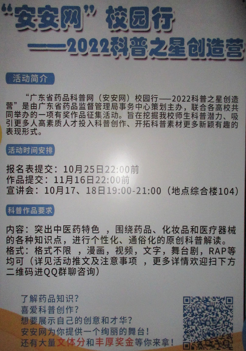 安安网校园行--2022科普之星创造营 报名提交10.25前 作品提交11.16前 宣讲会10月17、18日晚19点 综合楼104 安安网校园行--2022科普之星创造营作品征集活动 报名表提交10月25日22点前 作品提交11月16日22点前 宣讲会10月17,18日晚19点-21点 综合楼104 内容突出中医药特色,围绕药品、化妆品和医疗器械的各种知识点,进行个性化、通俗化的原创科普解读 了解药品知识?喜爱科普创作?想要展示自己的创作和才华?安安网为你提供一个绚丽的舞台!还有大量文体分和丰厚奖金等你来拿! |