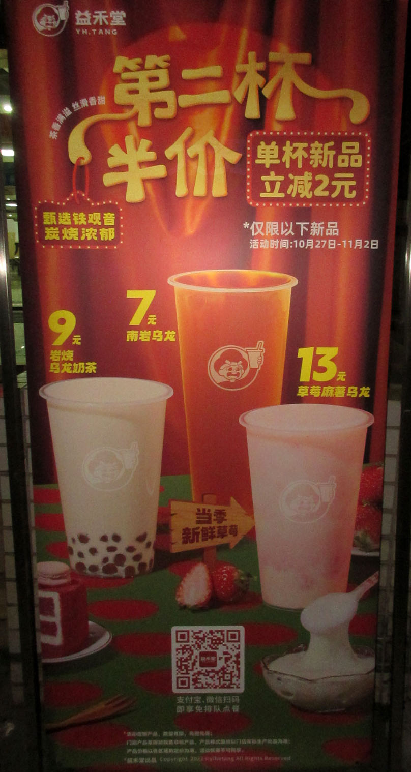 广中医一饭西北角 益禾堂 以下新品第二杯半价,单杯立减2元:南岩乌龙7元 岩烧乌龙奶茶9元 草莓麻薯乌龙13元 时间:10月27日-11月2日 |