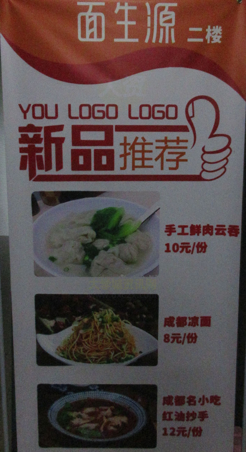 | 广中医生活区二饭二楼 面生源 新品推荐 手工鲜肉云吞10元1份 成都凉面8元1份 成都名小吃-红油抄手12元1份 | ||||||