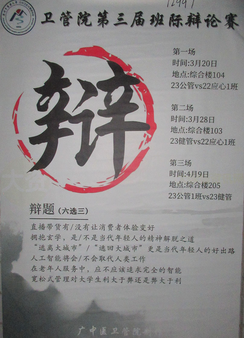 | 广中医-卫管院第三届班际辩论赛 辩题-六选三 第一场3.20综合楼104-23公管VS22应心1班 第二场3.28综合楼103-23健管VS22应心1班 第三场4.9综合楼205-23公管1班VS健管 | ||||||