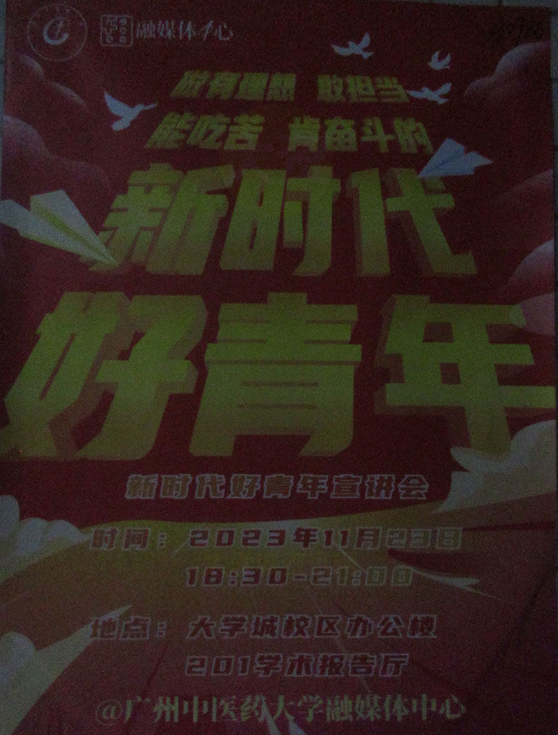 | 广中医-新时代好青年宣讲会 2023.11.23周四晚18点30-21点 教学区正门&办公楼201-学术报告厅 | ||||||