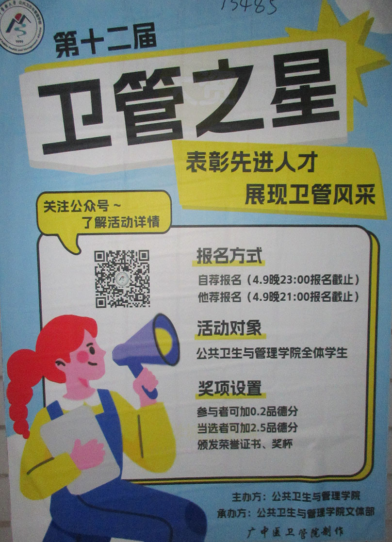 | 广中医-卫管院-第十二届卫管之星评选活动 面向公卫院全体学生 自荐与他荐报名截止于4.9号晚 关注公众号,了解详情 | ||||||