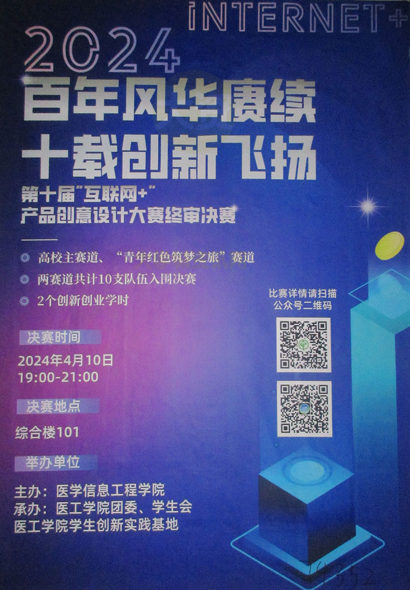 广中医-第十届互联网+产品创意设计大赛终审决赛 2024.04.10周三晚19点-21点 综合楼101 |