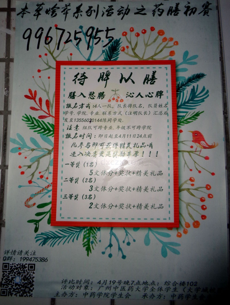 | 本草荟萃系列活动之药膳初赛 评比时间4月19号晚7点 地点:综合楼102 | ||||||