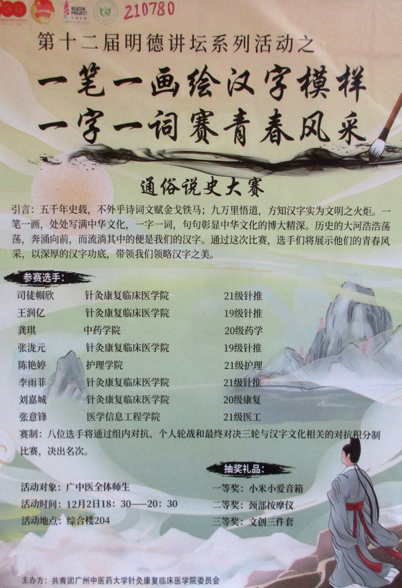 广中医 活动预告 一笔一画绘汉字模样 一字一词赛青春风采 通俗说史大赛 12月2日晚综合楼204 |