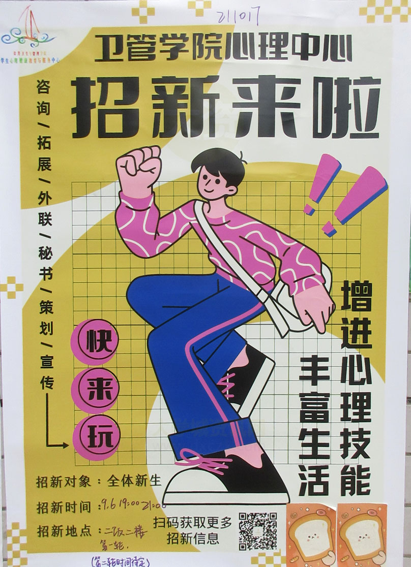 | 卫管学院心理中心招新第一轮 9.6晚19点-21点 二饭二楼 | ||||||