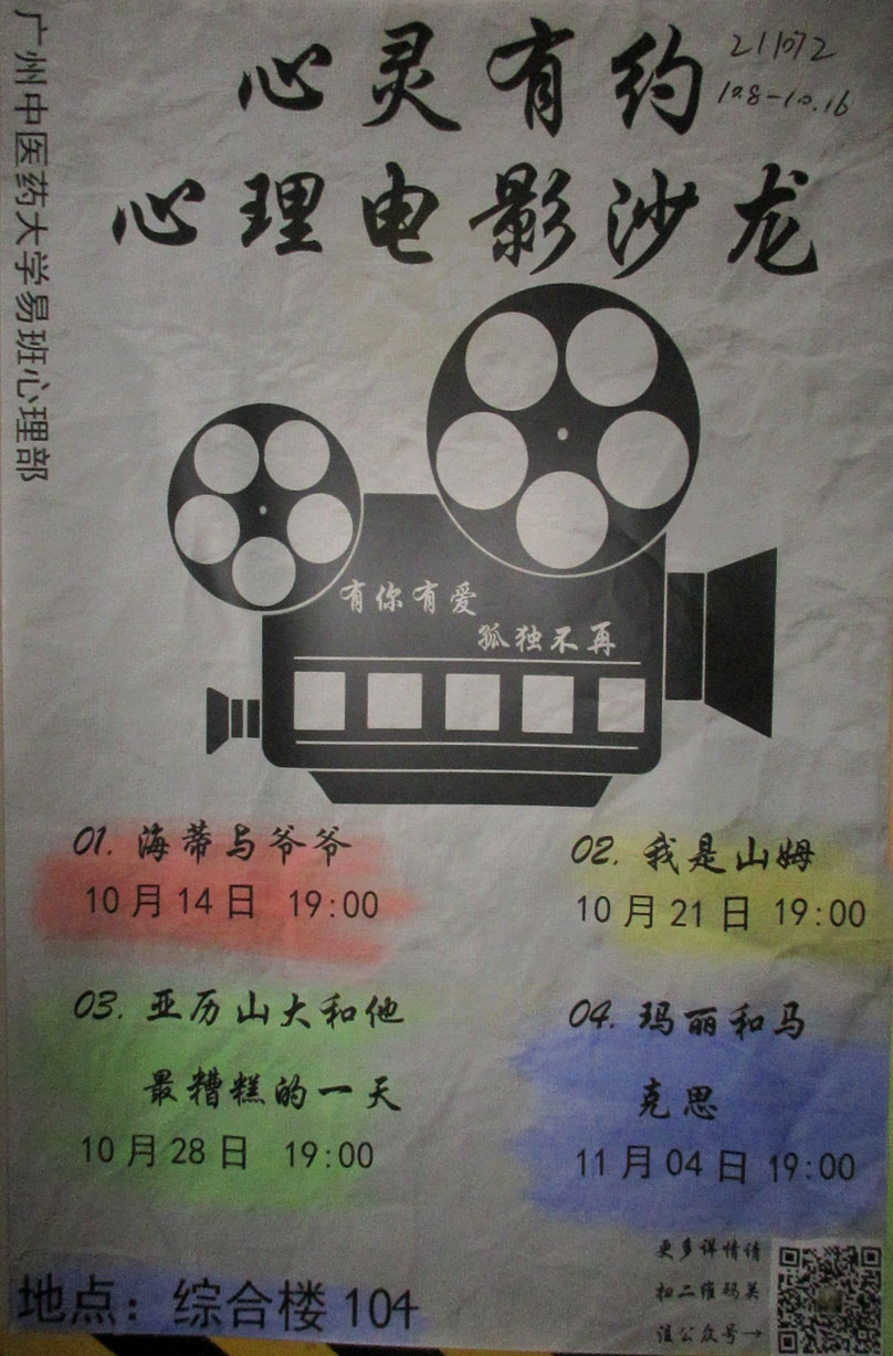 广中医易班心理部-心灵有约·心理电影沙龙 近期每周五晚电影放映预告 教学区综合楼104 |