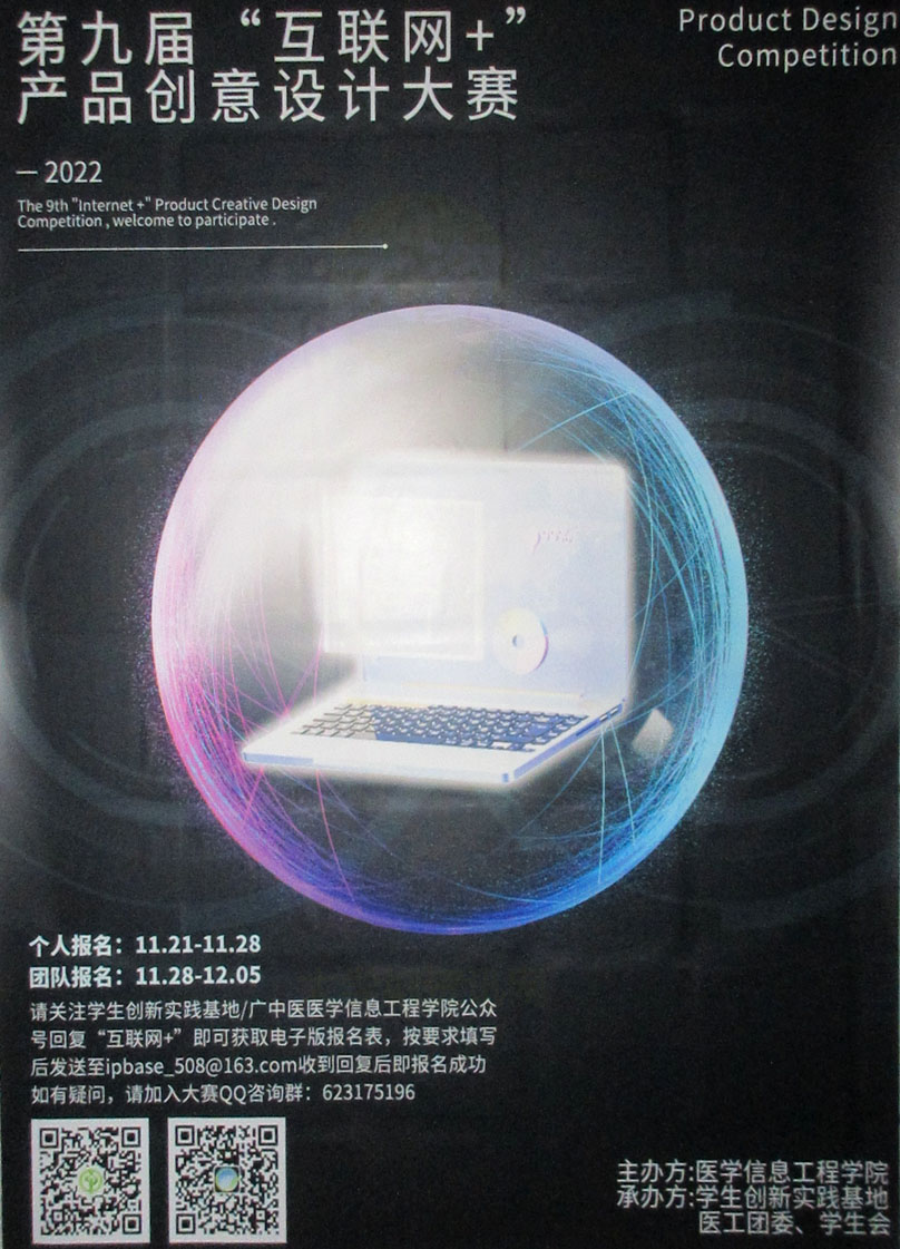 | 广中医2022第九届互联网+产品创意设计大赛 个人报名11.21-11.28 团队报名11.28-12.05 关注学创基地or医工学院公号可获取报名表了解更多可加入QQ群咨询 | ||||||