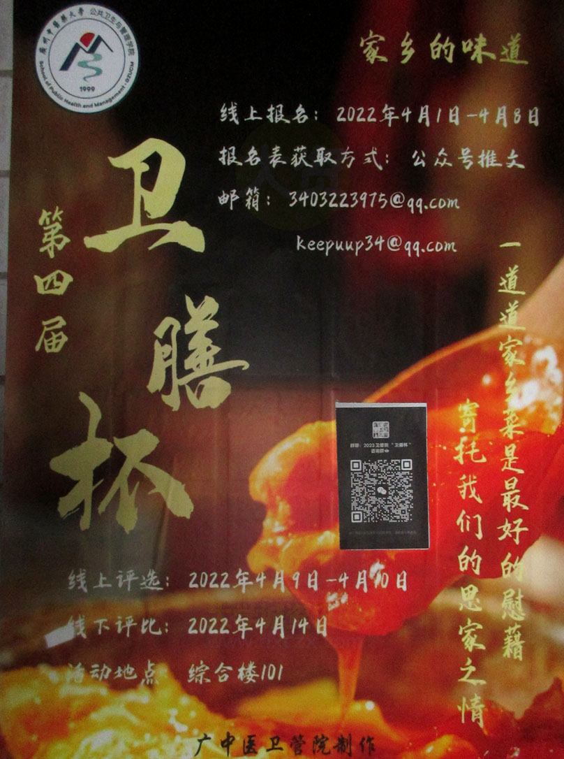 | 家乡的味道·广中医第四届卫膳杯 线上报名2023.04.01-04.08 公众号推文获取报名表 线上评选2023.04.09-04.10 线下评比2023.04.14 综合楼101 | ||||||
