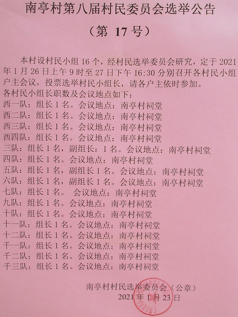 南亭村第八届村民委员会第17号选举公告-选举村民小组长-通知 |