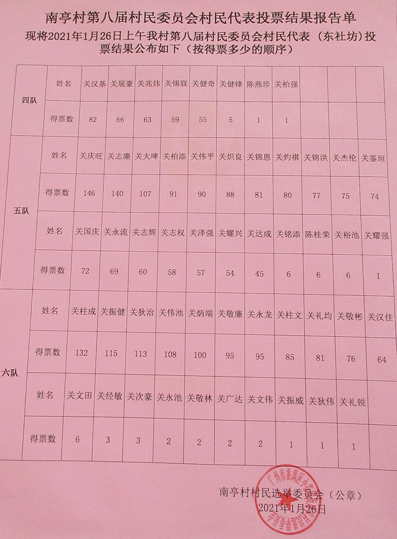 | 南亭村第八届村民委员会选举之(东社坊)村民代表投票结果公布 | ||||||