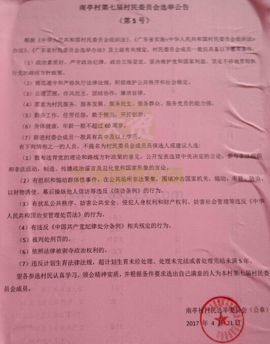 | 南亭村第七届村民委员会选举公告(第5号) | ||||||