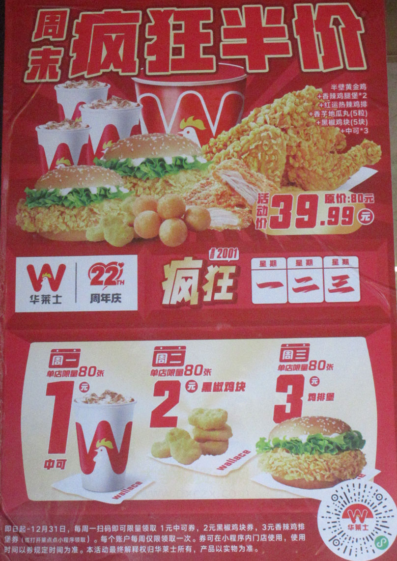 | 南亭大道南&下朗交汇 华莱士周末疯狂半价 多人组合套餐原价80活动价39.99元;22周年超低价限量券领取 | ||||||