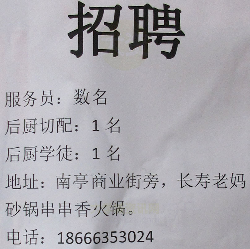 南亭某火锅店招聘服务员数名&后厨2名 |