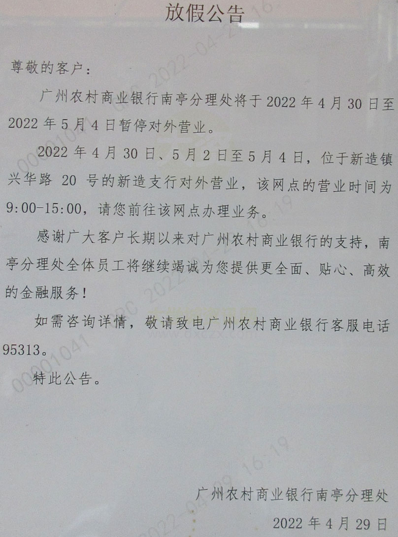 南亭农商行五一放假公告