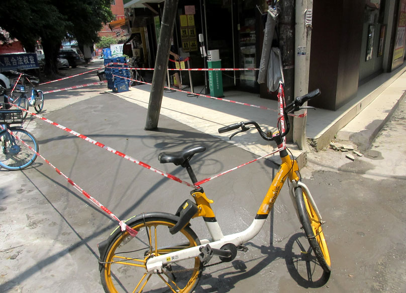 大参林药店门前新增砌水泥平缓斜面,与原地板瓷砖顺延出路面