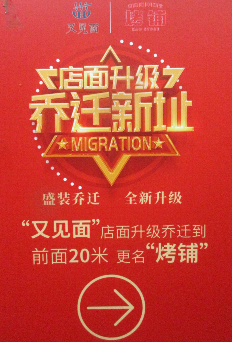 西社大街中 之前原格爵丝在装修的店面 原来是又见面,不远处的旧店已搬过这边,目前已新店开业,不过说改名叫烤铺,又见面不挺好吗,改后着重突出有烧烤类供应?