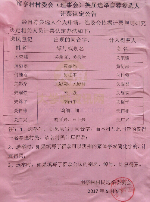 | 南亭村村委会(理事会)换届选举自荐参选人计票认定公告 | ||||||
