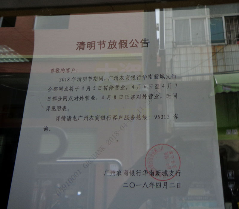 早先通告该农商行网点5、6号都暂停营业,估计是正好趁清明放假期间,进行一个装修升级换旧。