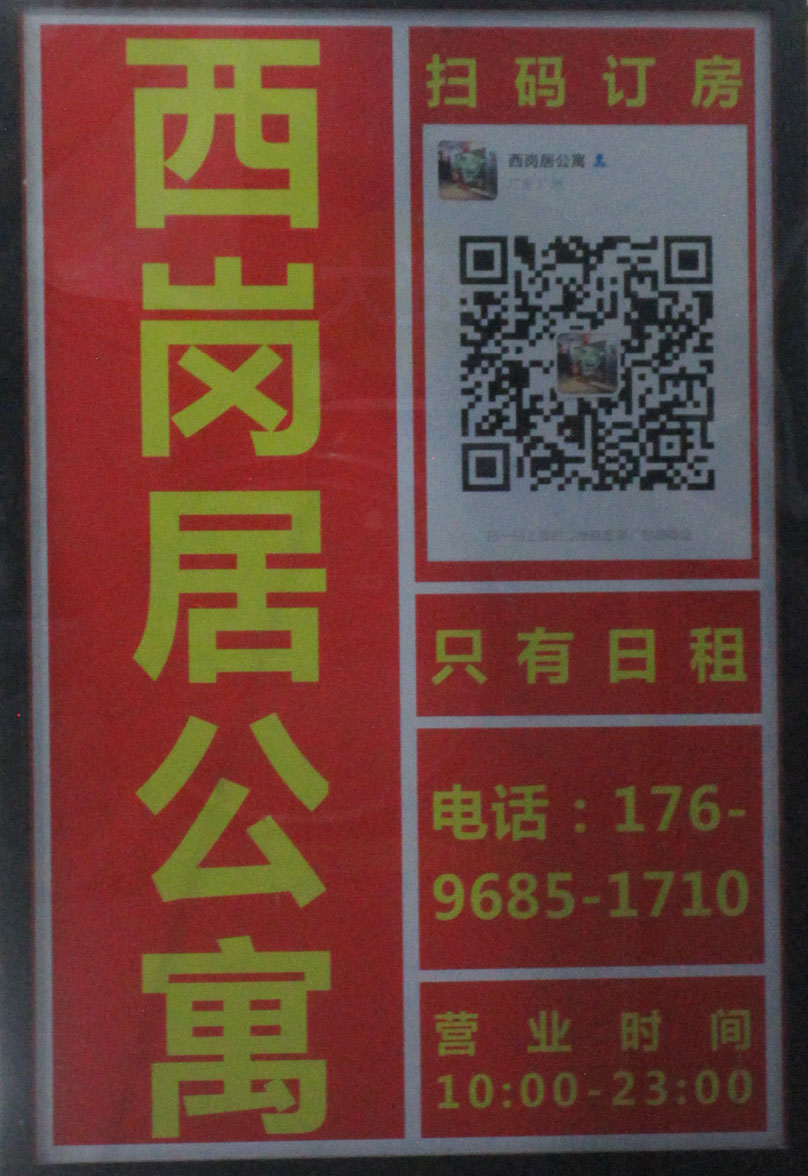 | 南亭村 西岗坡道中 西岗居公寓 电话17696851710 营业时间10点-23点 目前只有日租 扫码订房 | ||||||