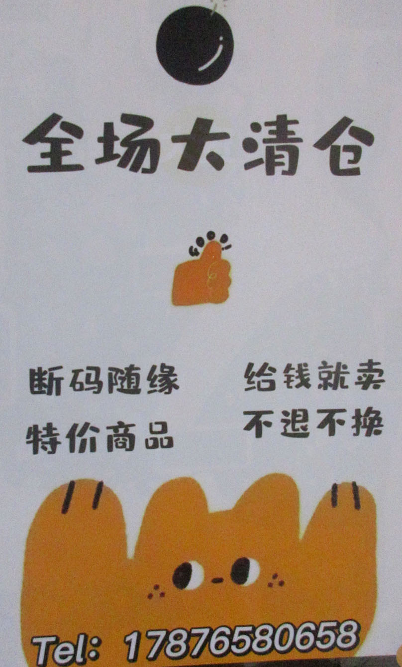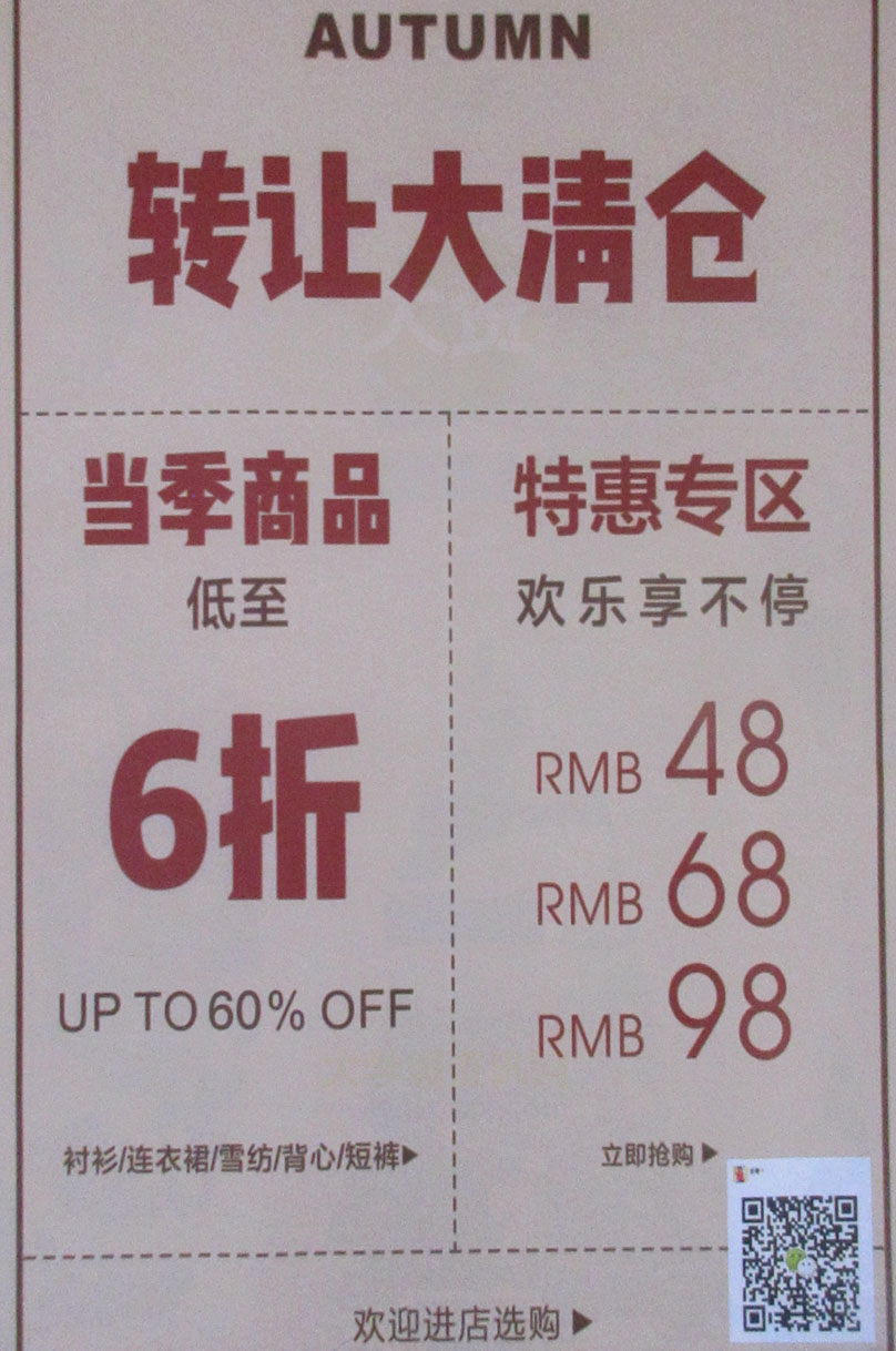 | 南亭西社大街中南 乐象AUTUMN服饰店 转让全场大清仓 当季商品低至6折,特惠专区RMB48,68,98 | ||||||