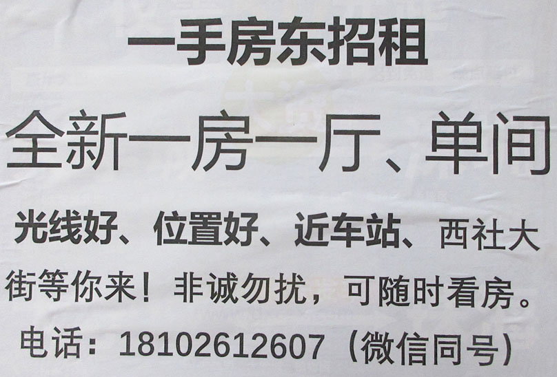 | 一手房东招租 全新一房一厅、单间 光线好、位置好、近车站,西社大街等你来 电话18102612607 | ||||||