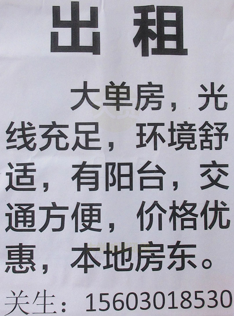 | 出租-大单间,光线充足,环境舒适,有阳台,交通方便,价格优惠,本地房东 关生:15603018530 | ||||||