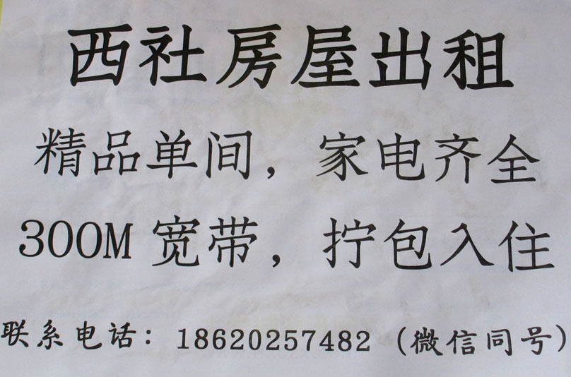 | 西社大街房屋出租 精品单间,家电齐全,300M宽带,拎包入住 联系电话:18620257482(微信同号) | ||||||