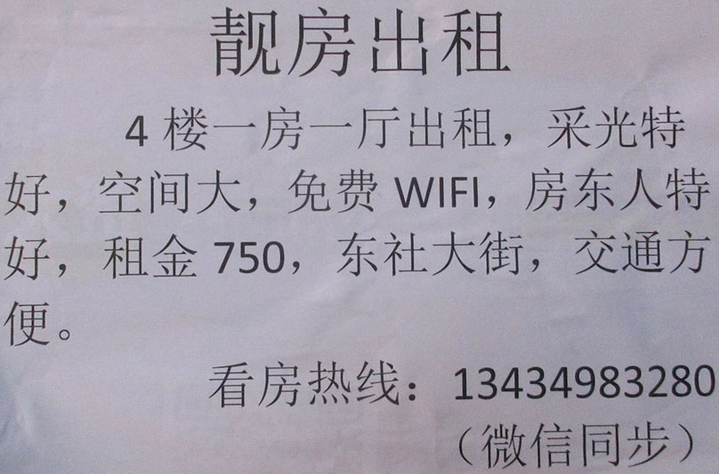 | 南亭-靓房出租 4楼一房一厅出租,采光特好,空间大,免费WIFI,房东人特好,租金750元,东社大街,交通方便 看房热线13434983280(微信同号) | ||||||