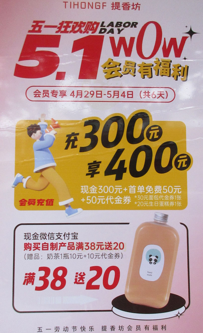 | 南亭大道中-提香坊蛋糕店 五一狂欢购会员专享 充300元享400元 现金微信支付宝购自制产品满38元送20赠品 | ||||||