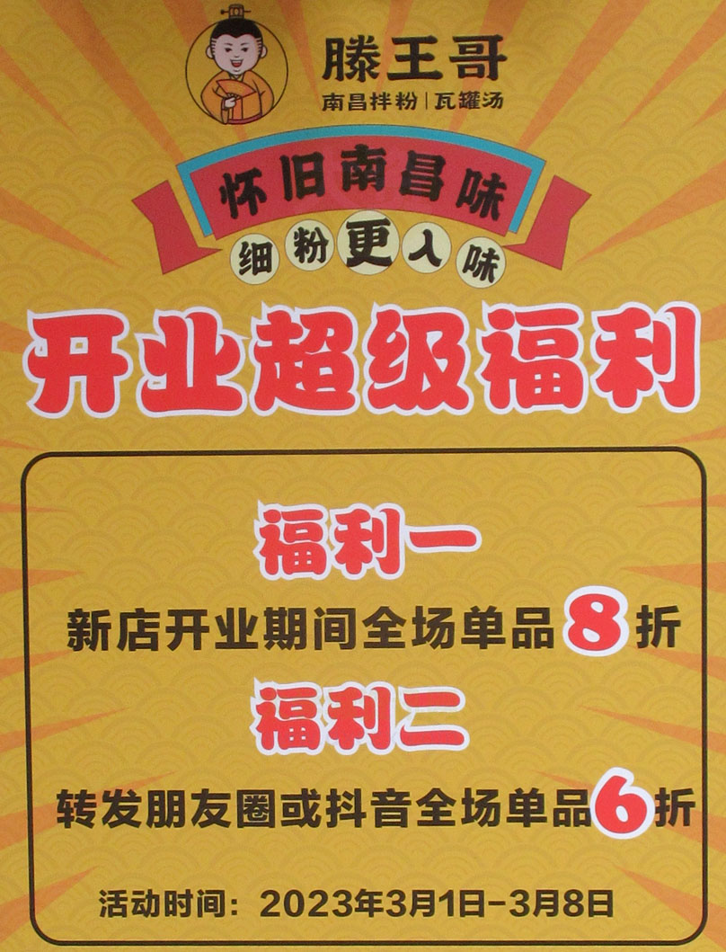 | 西社大街北这家新店滕王哥已经开业了 具体是做拌粉和瓦罐汤 开业期间3.1-3.8有8折福利 发圈or发抖还有6折 | ||||||