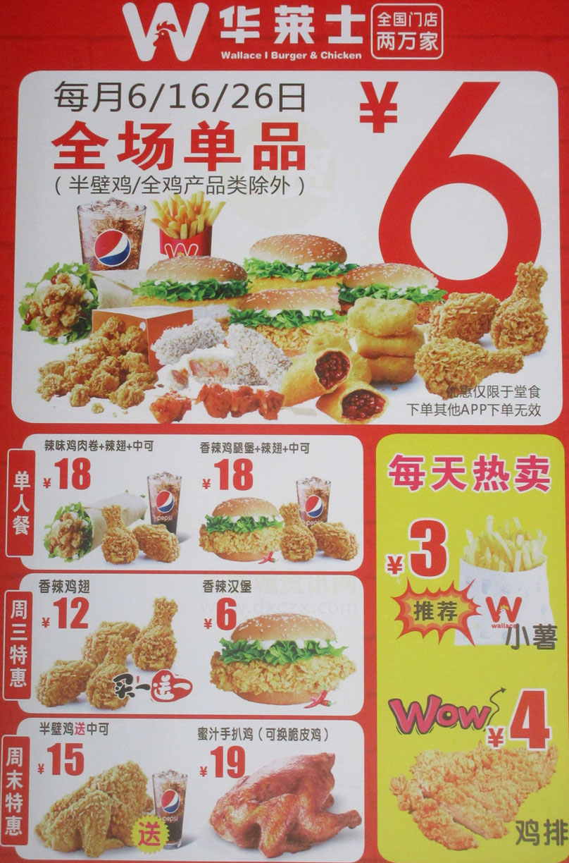| 南亭村-下朗大街南端 华莱士每月6/16/26号全场单品仅需6元 半壁鸡/全鸡产品类除外 同时是仅限于堂食 | ||||||