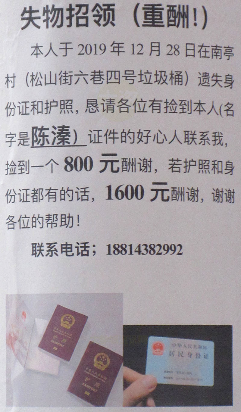 | 今天看到村里有人发遗失身份证和护照的寻物启事,拾还者有重酬 | ||||||