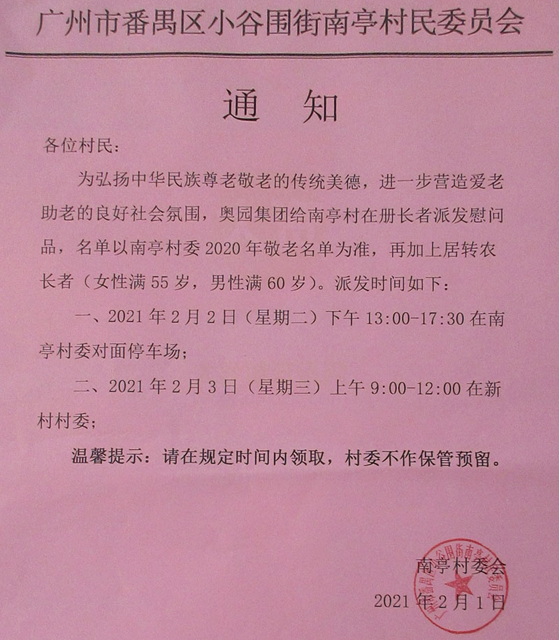 | 奥园集团给南亭村在册长者派发慰问品 请遵照时间地点到场领取 过时不作保管 | ||||||
