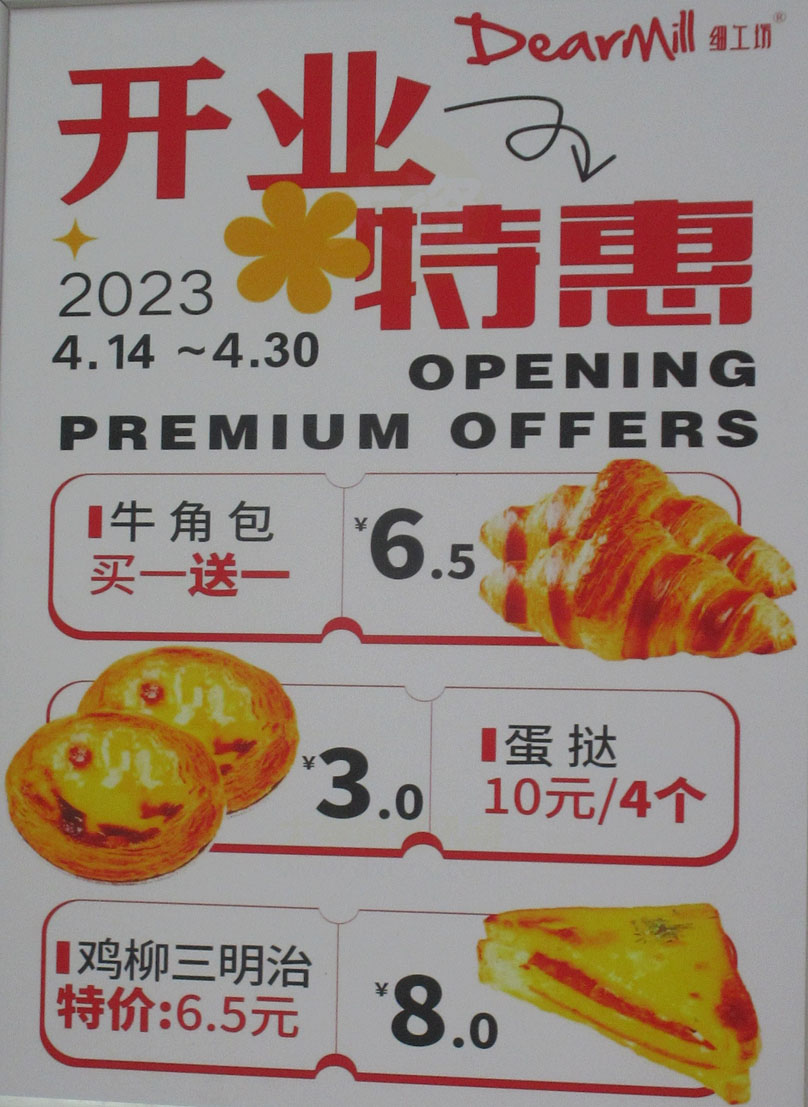 开业特惠-牛角包买一送一,蛋挞10元4个,鸡柳三明治特价6.5元