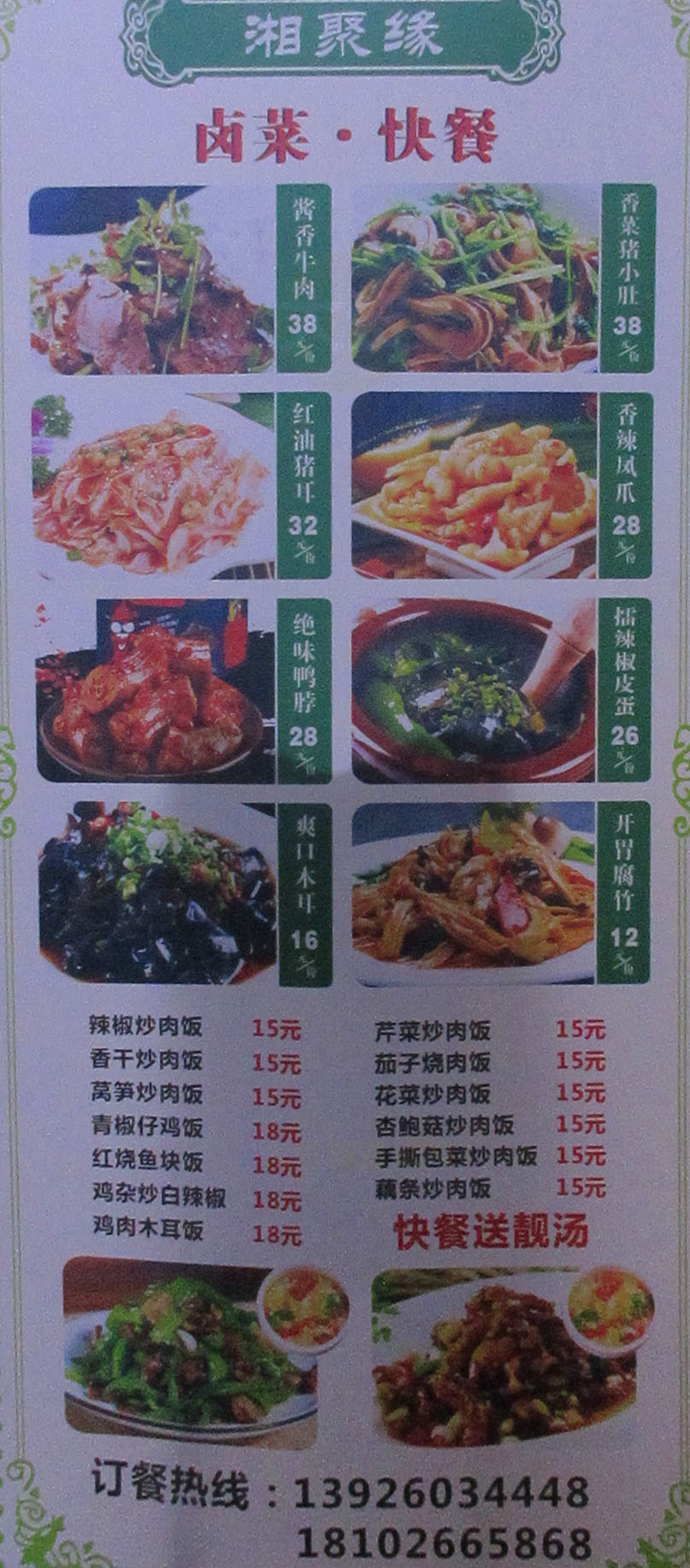 | 南商街四号楼中 湘聚缘 卤菜·快餐类最新推荐:酱香牛肉、香菜猪小肚、香辣凤爪……;快餐送靓汤 | ||||||