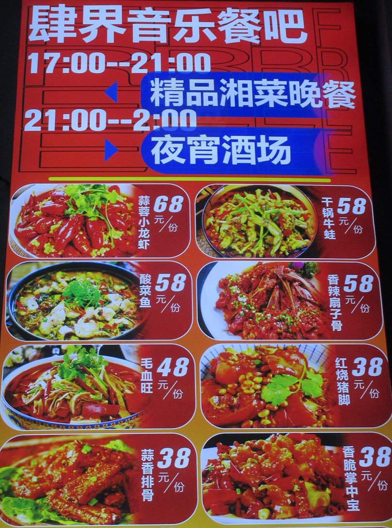 南商街九号楼西北侧上二楼 肆界音乐餐吧 17点-21点精品湘菜晚餐 21点-凌晨2点夜宵酒场 附最新菜式供应推荐