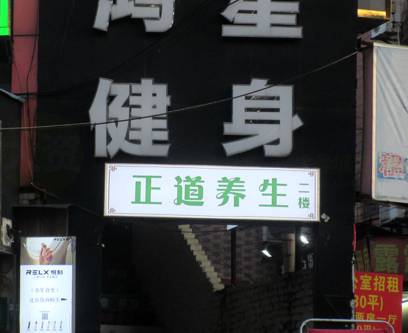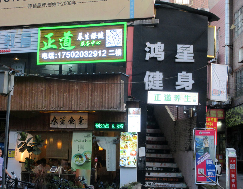 南商街四号楼北 正道养生 在鸿星健身入口楼梯上 增加了一个小灯箱招牌