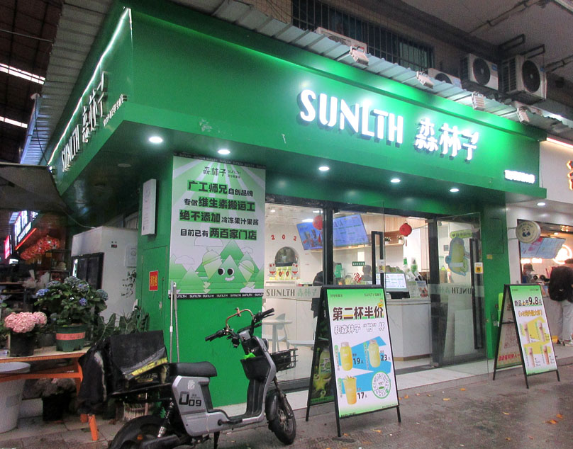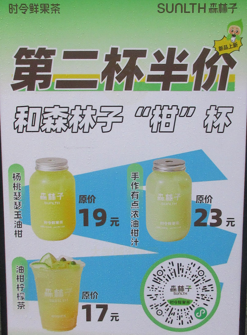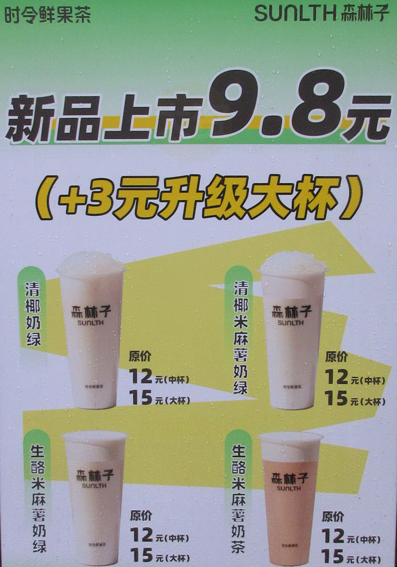 | 南商街八号楼东北角临街 森林子鲜果茶 新品上市9.8元 第二杯半价 +3元升级大杯 | ||||||
