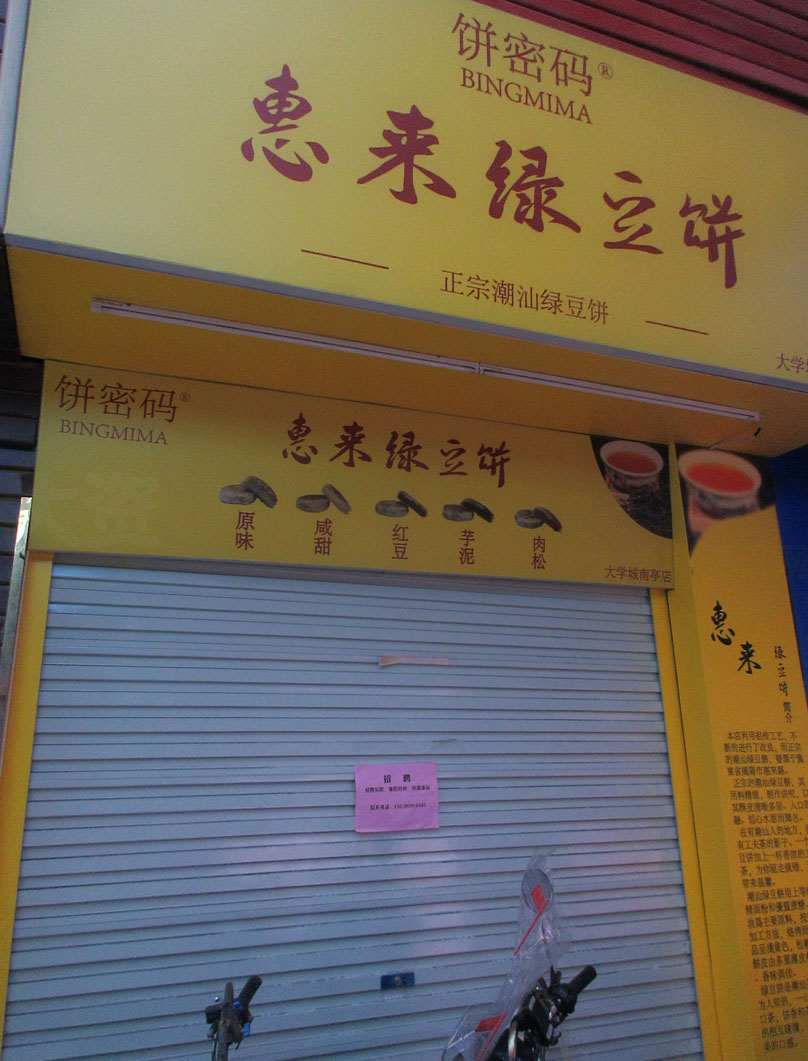 南商街十号楼东列北&淼鑫猪肚鸡楼梯侧 小铺位看到装修了家门面看着是叫惠来绿豆饼 似还未开业试业 可能店内也还不一定都完成装好 正在招聘店员