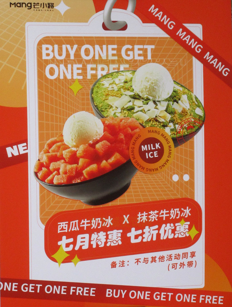 | 南商街十号楼东列南-新店芒小将 西瓜牛奶冰&抹茶牛奶冰 七月特惠七折(不与其它活动同享,可外带) | ||||||