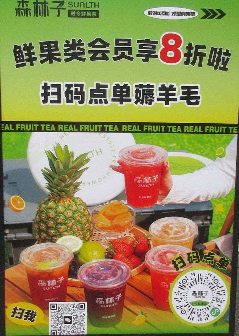 | 南商街八号楼东北角临街 森林子鲜果茶 鲜果类会员扫码点单享8折 芭乐系列新品尝鲜,第二杯半价 | ||||||