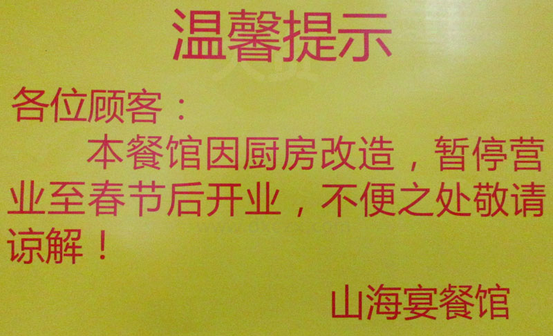 | 鲜值佳二楼山海宴餐馆说因厨房改造问题,现在已经暂停营业了,要到春节过年后再开业 | ||||||
