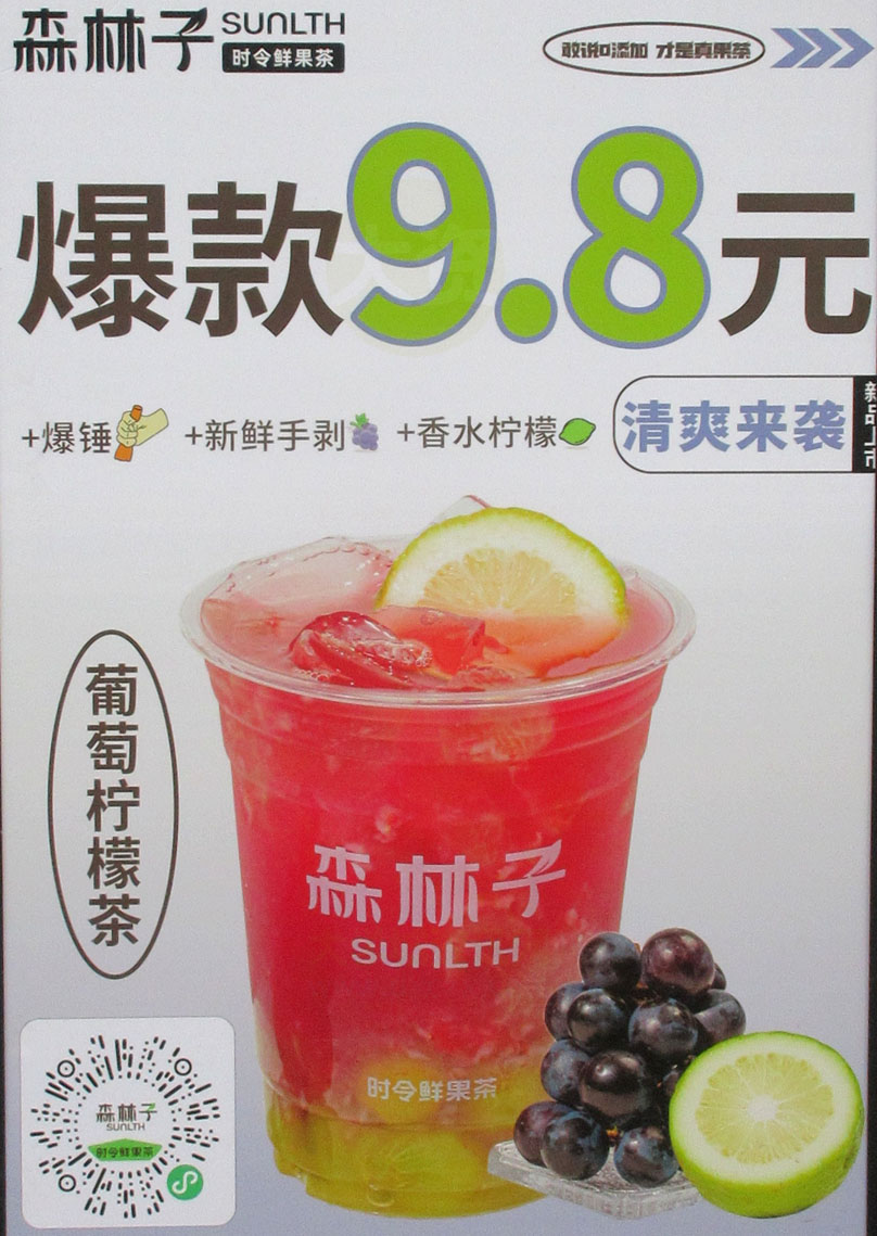 | 南商街八号楼东北临街 森林子茶饮店 清爽来袭 新品上市 葡萄柠檬茶 爆款9.8元 | ||||||