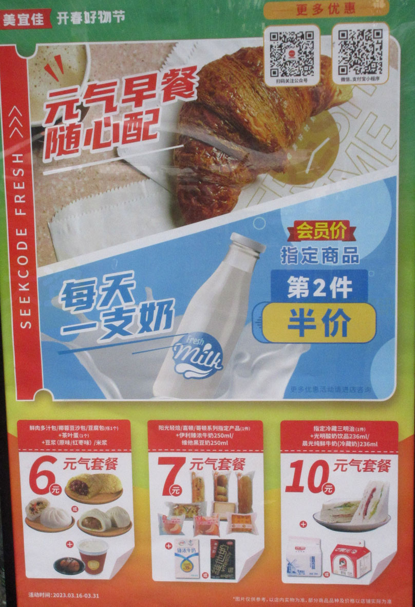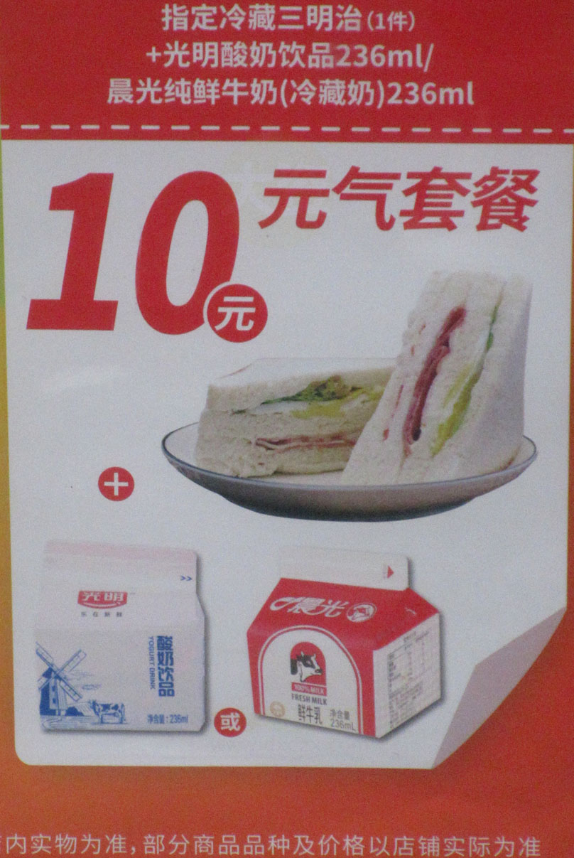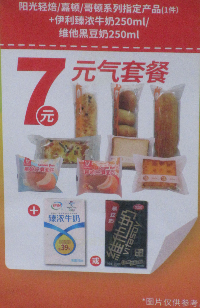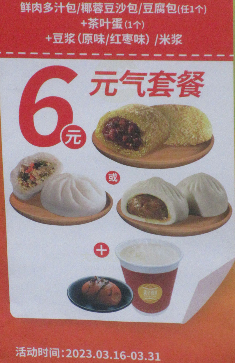 6元-元气套餐:鲜肉多汁包/椰蓉豆沙包/豆腐包(任1个)+茶叶蛋(1个)+豆浆(原味/红枣味)/米浆 7元-元气套餐:阳光轻焙/嘉顿/哥顿系列指定产品(1个)+伊利臻浓牛奶250ml/维他黑豆奶250ml 10元-元气套餐:指定冷藏三明治(1件)+光明酸奶饮品236ml/晨光纯鲜牛奶(冷藏奶)236ml 活动时间2023.03.16-03.31 更多优惠扫码了解or咨询店员